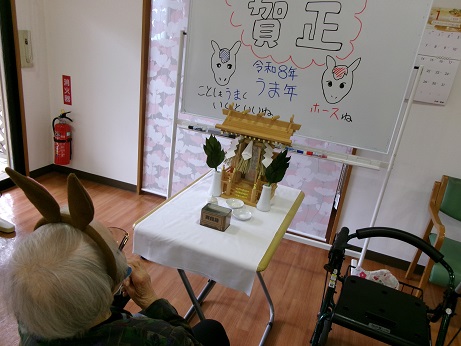 元気で過ごせますように…かな? うま耳をつけてのお参りです♡